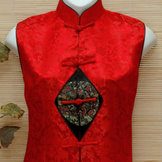 The Ancient Chinese Poetry trim adds an elegant touch to this beautiful satin Mandarin jacket accented with traditional frog buttons, and Mandarin collar in your choice of Red or Taupe. They make the perfect addition to every lady's wardrobe for those special occasions or when something "dressier" is needed.