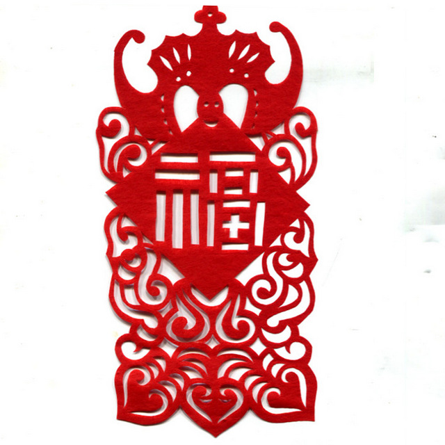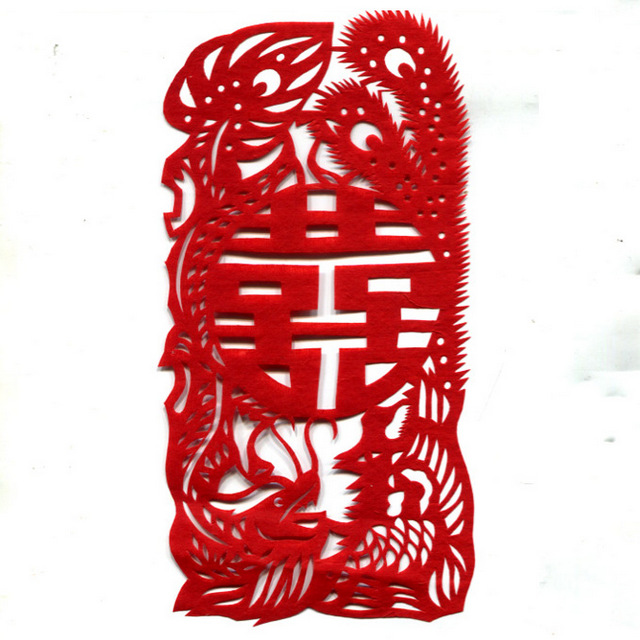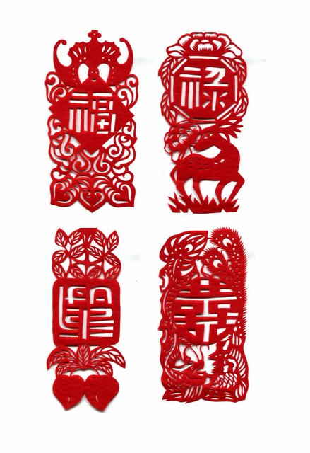 These large, brilliant red papercuts are excellent examples of the four most popular Chinese characters:"Fu Lu Shou Xi." The character Fu, for Good Luck and Happiness, is surrounded by a bat and scrollwork; Lu, for Prosperity, is set between a deer and peony blooms; Shou, for Long Life, is surrounded by a peach treeand peaches; Xi, for Double Happiness, sits between a dragon and a phoenix. These are great pieces of folk art and make unique decorations when mounted in ready-made frames and hung on your wall.