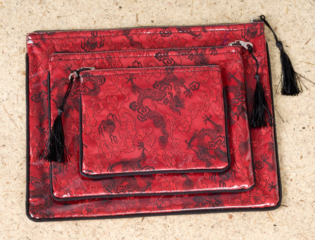 Organize your belongings beautifully with this set of three pouches. Designed with dragons and flowers on silk and vinyl-covered, the smallest pouch can be used for coins, keys, and other small items that seem to disappear in purses. The medium and large ones are just right for makeup and toiletry items. Each fully lined bag has a lovely knot zipper. Price is for one set of three bags. Choose from black or red.