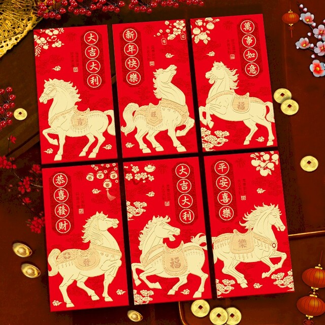 A set of red envelopes designed for the Year of the Horse. Each envelope features festive horse artwork and traditional decorative patterns in red and gold tones. Suitable for gifting money during Lunar New Year celebrations or other occasions, these envelopes provide a simple and themed way to share good wishes for the new year.
