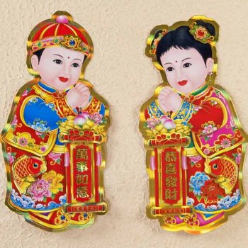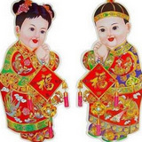 It is traditional to decorate for Chinese New Year with a poster set of greeting children. The pair of 3-D cut-out children in this set carry couplet scrolls with well wishes for the New Year. The boy holds a couplet with the Chinese characters "Wan Shi Ru Yi" - Wishes come true" and "Fu Gui Ping An" - Prosperity and safety. The girl's scroll is decorated with the Chinese characters "Gong Xi Fa Cai" - Wish you prosperity and "Ji Xiang Ru Yi" - Good fortune and good luck. Price is for a set of two posters.