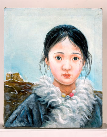 Set against a pale blue wintry background, a young girl with big dark eyes gazes out from this oil painting. Dangling gold earrings peek through loose strands of her pulled-back black hair, and a fur-collared coat covers her shoulders. Viewers of this painting can't help but gaze back.