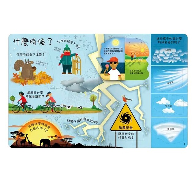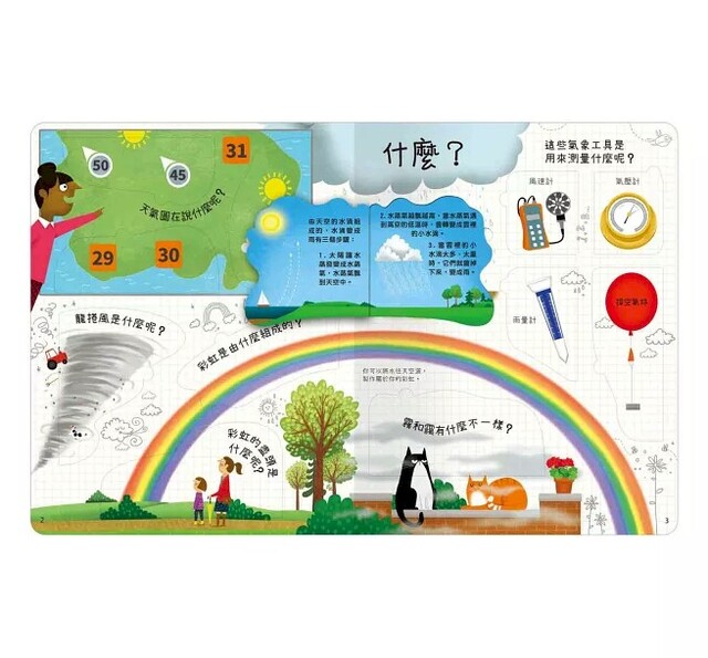 《關於天氣你想知道什麼?》天氣可以預測嗎?龍捲風是什麼?每分鐘可以掉下多少雨水?彩虹是由什麼組成的?天氣用什麼工具測量的?快來翻翻書找答案,一起探索大自然中神奇的天氣變化吧!