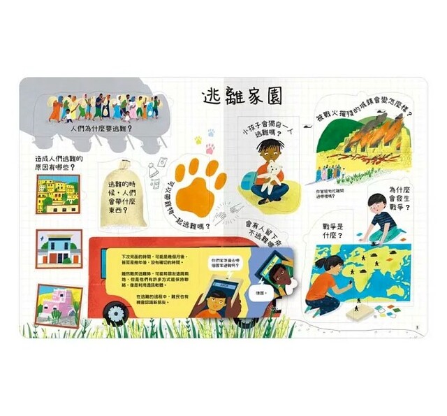 《關於難民你想知道什麼?》難民是什麼?他們住在哪裡呢?為什麼難民要逃難呢?如果發生戰爭,我們應該攜帶什麼東西呢?快來翻翻書找答案,一起了解難民的處境