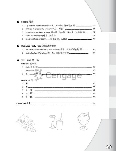 Chinese Treasure Chest: Food (Student Workbook) is filled with opportunities for students to learn about many different topics related to food. Fruits, Vegetables, Chinese Food, American Food, Healthy Food, and Snacks are among the topics in the workbook. It offers a wide variety of activities such as games, puzzles, mini-books, and science-based activities. This workbook is designed for beginners of all ages. It can be used for individual learning or in Chinese classes.