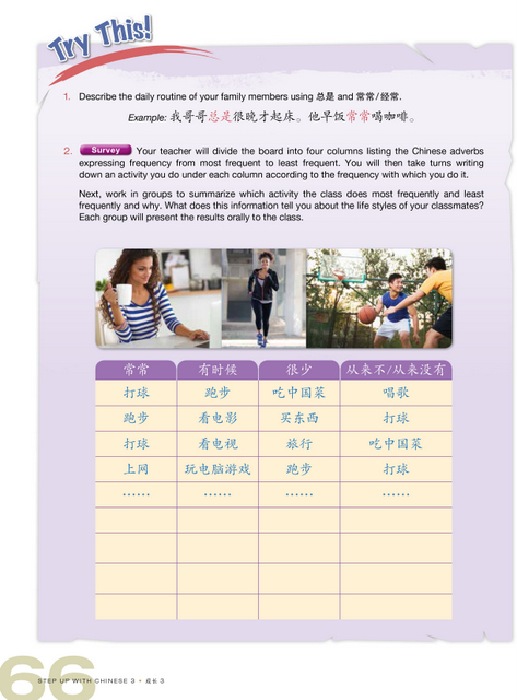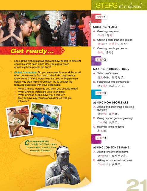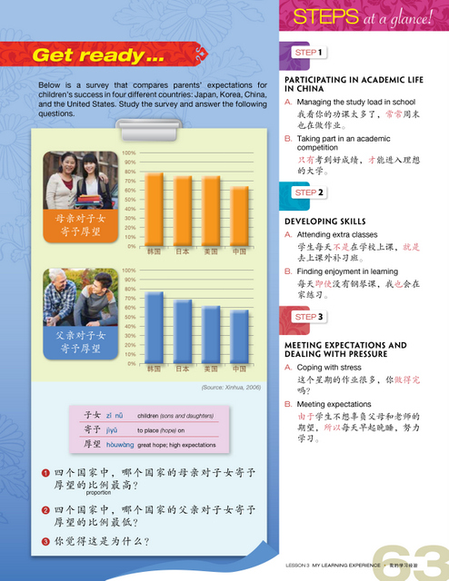 Step Up with Chinese《成长》is a pioneering, standards-based introductory Chinese textbook series designed by North American educators in collaboration with Chinese language specialists at the Beijing Language and Culture University. Highly learnerfriendly and task-centered, Step Up develops all four language skills while incorporating the ACTFL 5Cs. Students will learn all the necessary material to engage others in meaningful communication and gain a better understanding of the Chinese culture. This second edition features updated content, new images, and an additional vocabulary index that facilitates Chinese word search via English keywords. This series consists of three levels covering three to four years of instruction. Each level includes a Textbook, a Workbook and a Teacher’s Guide. Each Textbook offers ten thematic-based lessons. The accompanying Workbook features a wide variety of different types of exercises to enhance students’ proficiency in all four language skills. The Teacher’s Guide can be downloaded from the program’s companion website which also offers a pinyin pronunciation guide, interactive vocabulary flashcards, mp3 files, and additional practices. Step Up makes an excellent course material for high school students as well as highly-motivated middle school students who have had little or no prior exposure to the Chinese language.