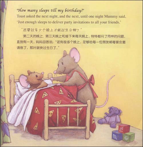 Toast, a fieldmouse, is very excited about his birthday. 'How many sleeps is it now?' is his constant refrain. Each day seems to pass more slowly than the last for poor Toast - 'How many sleeps now?' he repeats. Together he and Mum begin all the exciting preparations, as his big day draws ever nearer. But Toast is not the only one ticking off the days. Dad is trying to make Toast a very special, very secret present, and time is running out. Will he make it in time? Are there enough sleeps left? Ages 4-8.