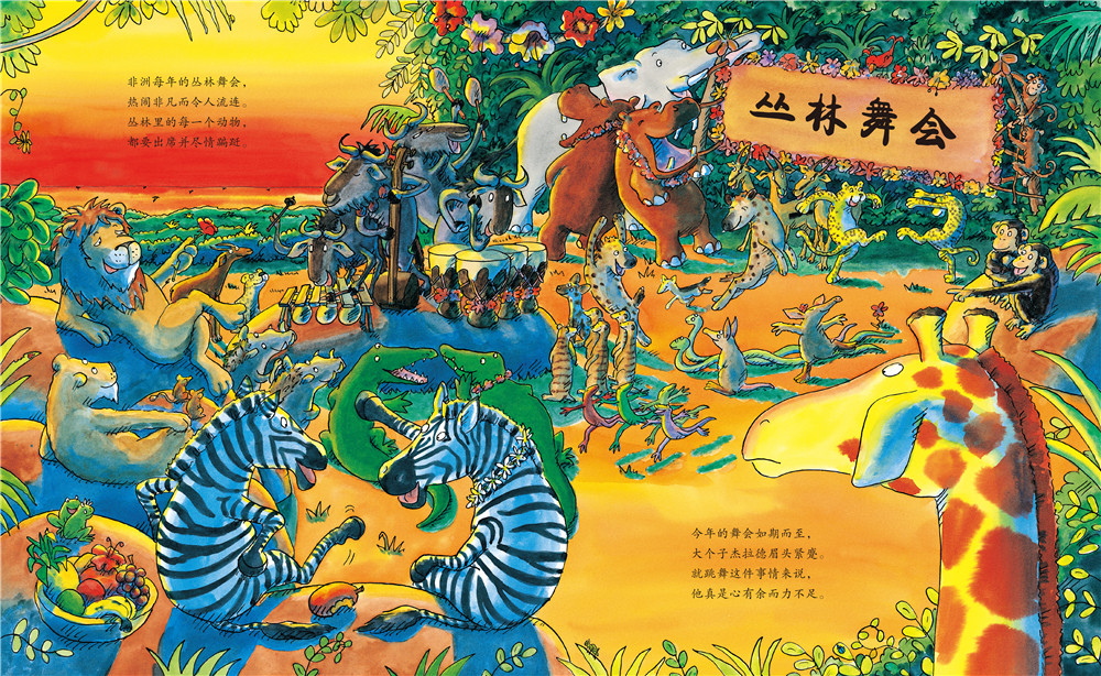 长颈鹿杰拉德并没有很伟大的理想,他只想像大家一样能够跳舞。但是,他的膝盖是弯曲的,腿也过于细长。因为在一年一度的丛林舞会中摔倒了,其他动物都嘲笑他。但是一只不起眼的蟋蟀却鼓励十分沮丧的长颈鹿,劝他寻找适合他自己的音乐,*终长颈鹿跳出了非常美丽的舞蹈、这个小故事告诉小朋友们:每个人都很棒。
