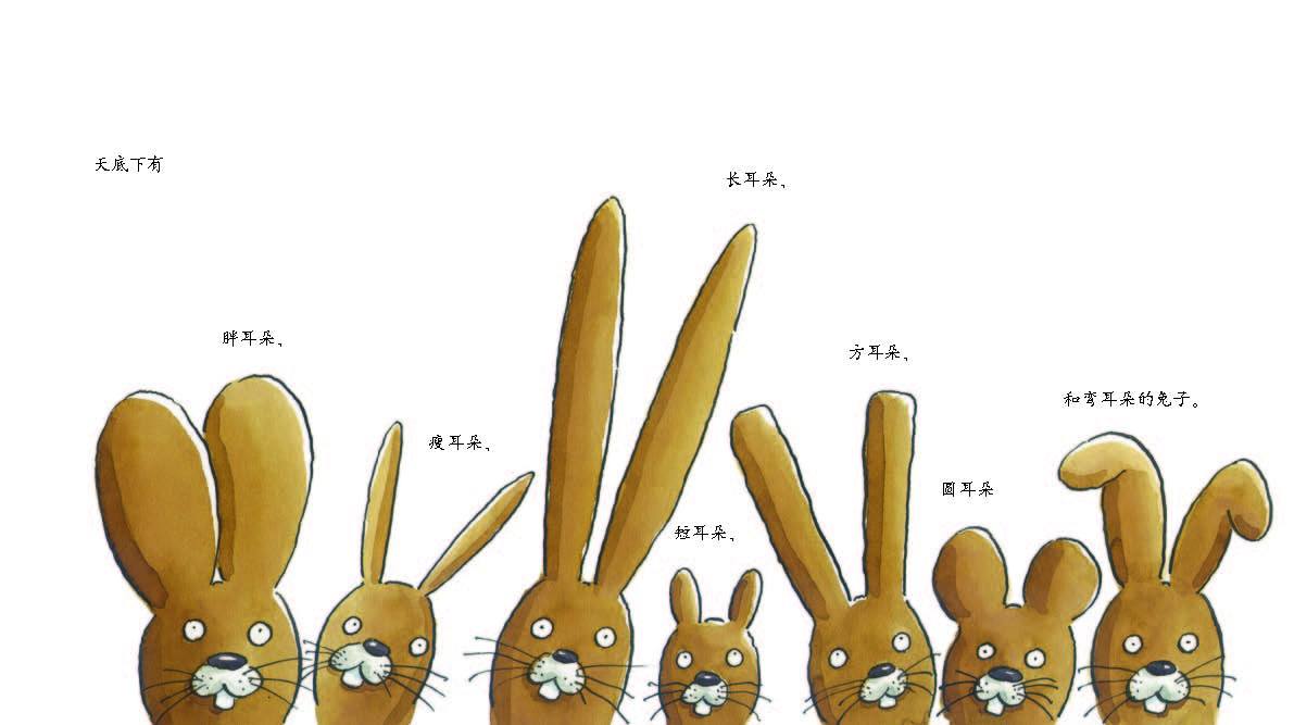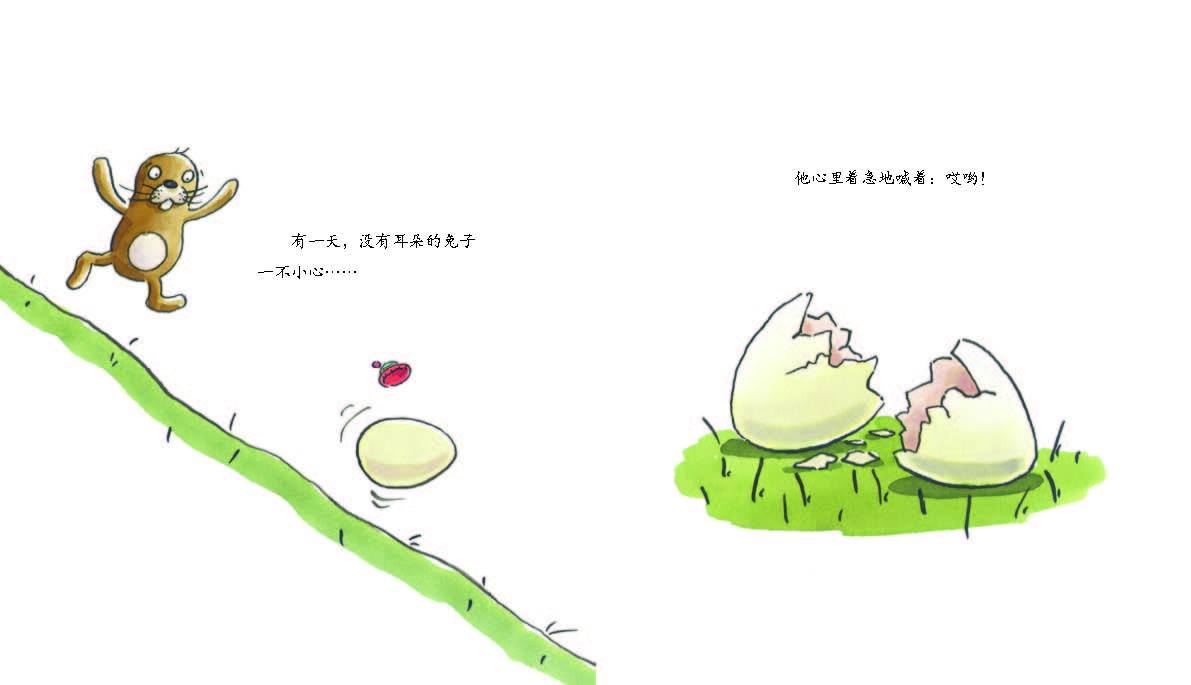 《没有耳朵的兔子》 有一只没有耳朵的兔子,他能跑、能跳、爱吃胡萝卜。其他的兔子都和他做朋友,就连狐狸都懒得捉他。可是,在他捡到了一个蛋后,一切都变了……图书富有创意地将电影拍摄技巧融于绘本当中,形成独特的画面语言。作者用巧妙的构图和温馨的画面,告诉读者:不管你有多特别,只要能够认同自己,同样能够快快乐乐。