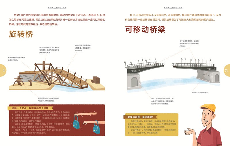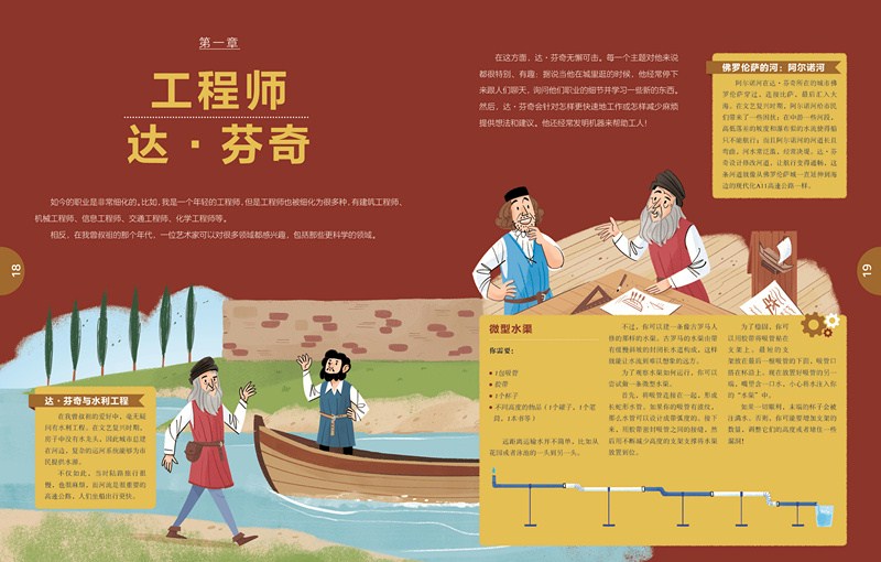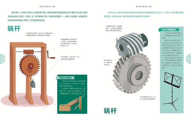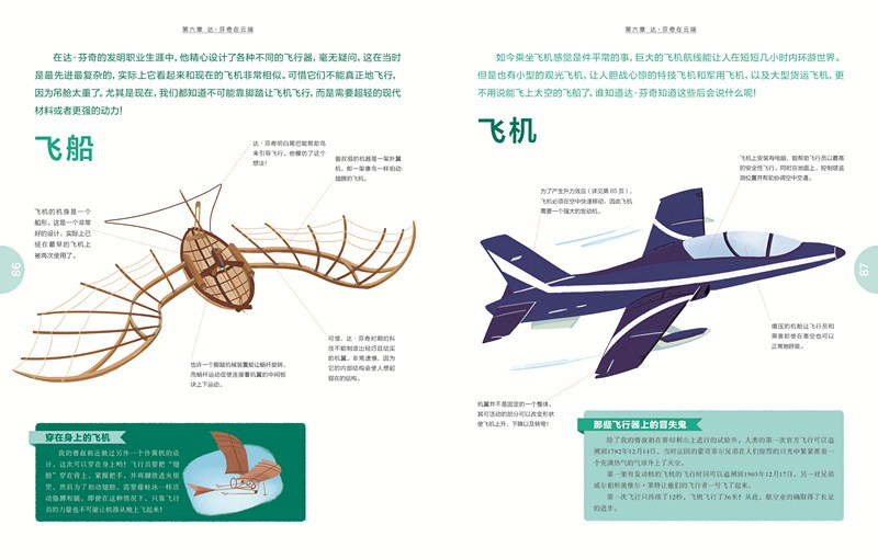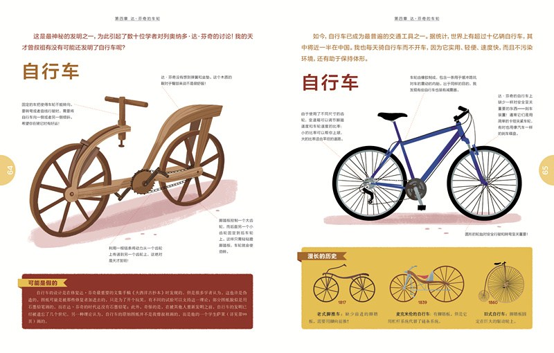 《达•芬奇的天才设计》通过列奥纳多•达•芬奇的后代曾侄在一次青年工程师年会上与同事的对谈展开介绍,图文并茂地回顾了达•芬奇的生平经历以及他在水利工程、军事、建筑、机械工程、医学、文化艺术等方面的各种重要发明,比如潜艇、坦克、风扇、螺钉、吉他、起重机和计算器等。达•芬奇500多年前设计的38台机器与现代仍在应用的机械装置在页面上形成鲜明对比,让读者可以清楚地看出有哪些相同与不同之处,感受这位伟大天才的非凡魅力。书中还包含许多与达•芬奇的发明相对应的实验,让孩子们通过动手操作进一步理解并掌握其中的科学原理,真正做到学以致用。