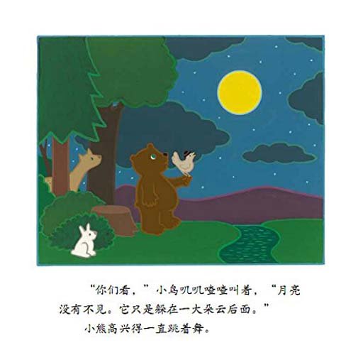 在这个故事里,小鸟教小熊玩了一个有趣的游戏——捉迷藏:蒙上眼睛,从一数到十……后来,小熊请月亮和他一起玩捉迷藏。没想到,这场捉迷藏游戏从一开始的兴奋、快乐变成了担忧甚至绝望,小熊担心从此再也找不到他的朋友了……它向小鸟和其他动物寻求帮助,大家一起努力,终于把月亮找出来了。