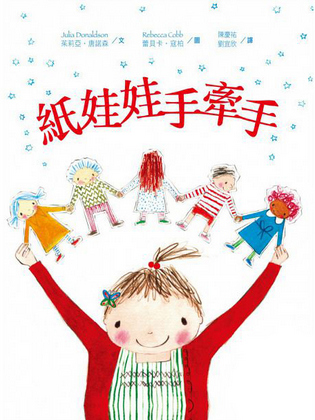 紙娃娃手牽手,永遠不放手!他們串起的,不只是單純美好的童年回憶,還有母女之間的愛,這些,都將一代一代傳遞下去……關於一個小女孩和五個紙娃娃美麗動人的故事。穿著老虎拖鞋、戴著蝴蝶髮夾的小女孩,跟媽媽一起做的牽手紙娃娃,是她最心愛的玩具了。他們是迪奇、塔奇、背影傑琪、雙鼻吉姆,還有蝴蝶結喬。這五個牽手紙娃娃,陪她一起度過了好多奇幻美妙的冒險時光。看哪!勇敢的紙娃娃敏捷的躲過了恐龍(玩具)、鱷魚(隔熱手套)、老虎(拖鞋)的攻擊,到處去探險、嬉戲、玩耍。紙娃娃手牽手,無論遇到什麼危險,他們都不放手,一起面對所有的冒險和挑戰~但是,有一天,現實世界裡的調皮小男孩,用剪刀把小女孩心愛的紙娃娃全都剪碎了……但是紙娃娃沒有消失,他們被珍藏在小女孩的美好回憶裡……後來,小女孩長大了,當了媽媽。她也帶著女兒一起做了一串紙娃娃……《紙娃娃手牽手》是英國兒童文學桂冠得主茱莉亞.唐諾森與英國繪本界插畫新秀蕾貝卡.寇柏的首次合作,繪本界的新舊世代攜手創作,彷彿也象徵著將繪本的美好意涵一代代傳遞下去。