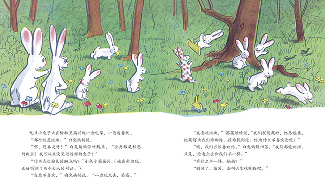 《兔子斑斑》:斑斑出生在一个白兔家庭。其他兔子都长着雪白的毛、粉红的眼睛,只有他长着棕色的斑点、蓝色的眼睛。妈妈爱斑斑,却害怕爷爷不能像喜欢别的小兔子一样喜欢他。在去参加爷爷的生日派对时,斑斑被独自留在家。斑斑很伤心,离家出走。在树林里,斑斑遇到和他长得一样的棕棕先生。与众不同的小兔子能得到大家的认同吗?