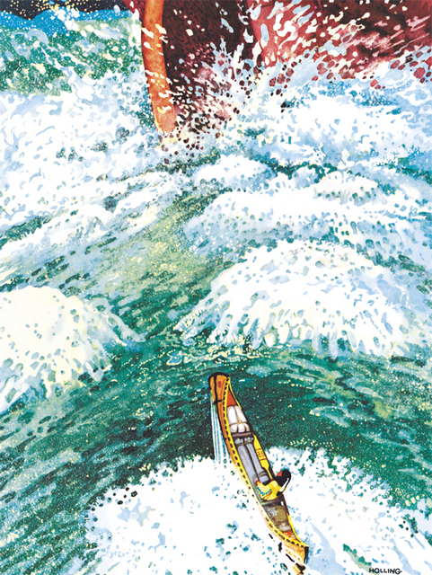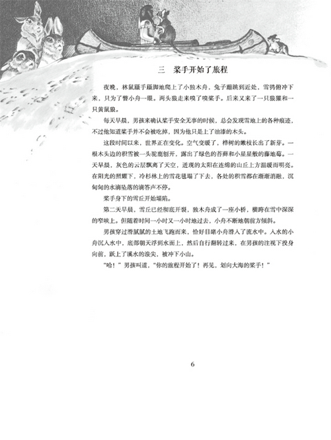在五大湖以北的尼皮贡,一个印第安男孩刻了一个乘着小舟的印第安人偶,称其为划向大海的桨手。桨手被放置在雪丘上,春天的阳光使积雪融化成奔腾的山溪,桨手开始了他的旅程:他从被水冲开的缺口挤出了*的池塘,还避开了锯木厂饥饿的大锯;他目睹了货轮在深秋风暴中遇难,也见证了野生动物在山林大火中脱险;在不同的风和水流的吹拂击打中,在途中人们的帮助下,他终于穿越五大湖,抵达大西洋,成为了真正的划桨入海的桨手。