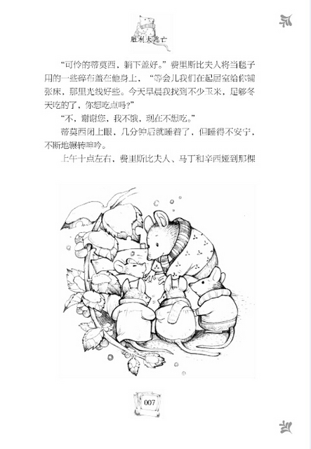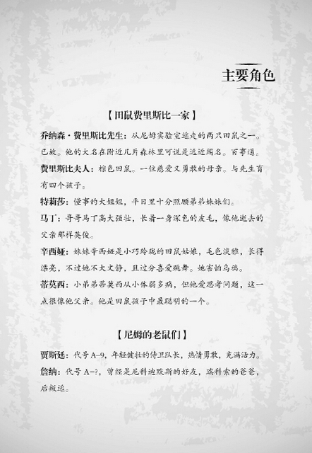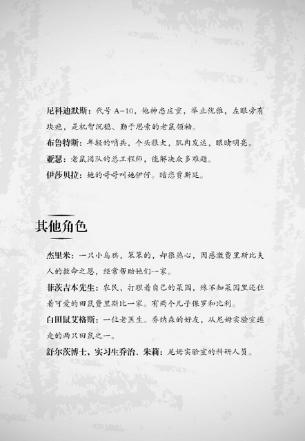 这部关于老鼠的旷世传奇,以不寻常的情节架构和出色的角色塑造,将纽伯瑞金奖等美国各大奖项收入囊中。每一页都通过各种方式吸引着读者,令他们一口气读到令人振奋的结尾。作者父女俩也创造了一个小而全的世界——荆棘山谷老鼠社区,带领读者进入到纯洁美好的心灵世界。塑造出的田鼠费里斯比夫人——一个对儿子的关心胜过她所有对天敌的恐惧的勇敢慈爱母亲形象,在整本书中最为突出,将让读者铭记于心。请点击查看分册介绍.