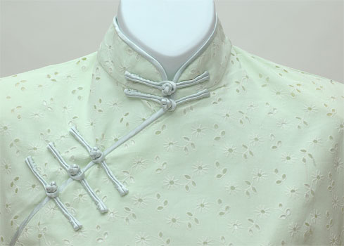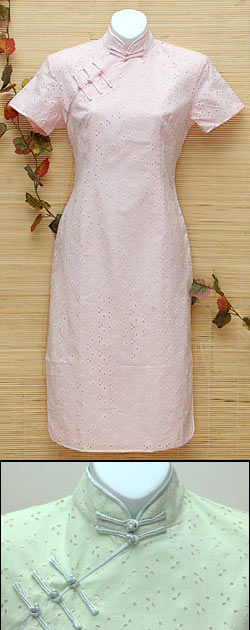 These beautiful Mandarin dresses (Qipao or Cheongsam) are designed with light and airy cotton eyelet fabric featuring a floral design. Fully lined with the rayon. Perfect for any special occasion. Sure to turn heads!