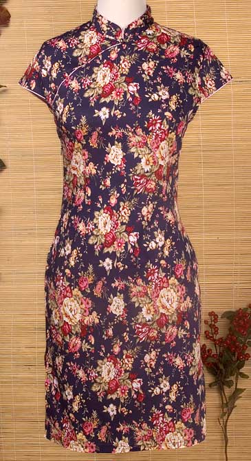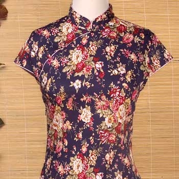 Delicate sprays of autumn flowers decorate this form-fitting, short-sleeved Mandarin dress (Qipao or Cheongsam). Set against a navy blue background this evocative dress has a traditional mandarin collar with a frog buton closure at the neckline. Please note the sizes you order are American sizes. Do NOT rely on the size letters on the labels.