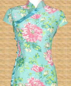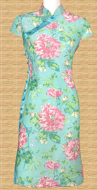 A floral fantasy, this unqiue Qipao or Cheongsam features dramatic peony flowers floating across a background of jade green linen. The form-fitted dress is finished with with knot button closures across the shoulder and down the side of the dress. Perfect for any special occasion or night out.