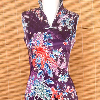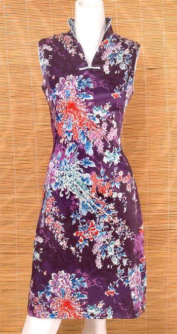 Bouquets of brightly colored flowers against a backdrop of purple silk adorn this beautiful Mandarin dress. Known as a Qipao or Cheongsam, the dress is form-fitted and sleeveless with one frog button closure on the neck. Perfect for any special occasion or night out.