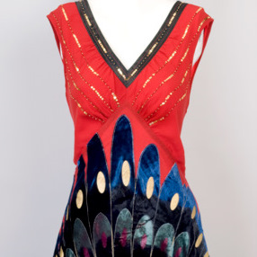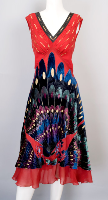 Enjoy a night out as the center of attention when wearing this stunning phoenix inspired dress. Created from two of the most luxurious fabrics -- velvet and silk -- which come together to create an elegant alternative to the every day party dress. The skirt of the dress is designed with the peacock-like feathers of fenghuang (the phoenix bird). Bold velvet tail feathers of purple, blue and black strike a stunning contrast to the red silk fabric that make up the bodice and hemline of the dress. Finished with a v-neck and golden accents across the bodice.