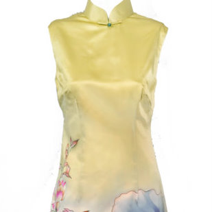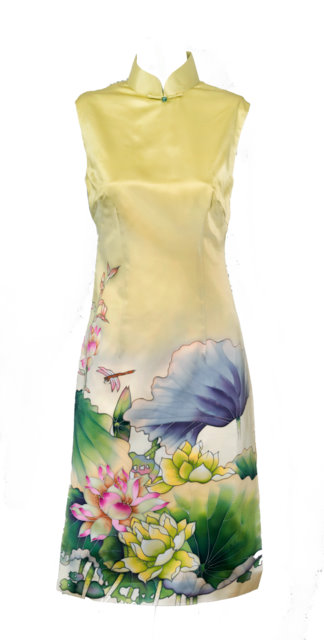 Fashioned in the traditional style, this sleeveless Qipao is created from silk of the highest quality. The green silk provides the canvas for a gorgeous lotus pond scene. Dragonflies buzz amongst the colorful lotus flowers and their large green leaves to create a walking piece of art. Each of these dresses is hand painted, so no two are exactly alike. Fully lined with high quality silk.