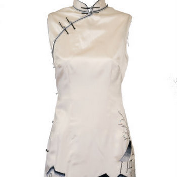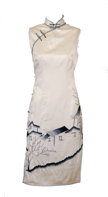 Momentous occasions call for equally memorable attire. Fashioned in the traditional style, this stunning qipao is made from the highest quality silk and features a hand-embroidered village scene. Silver accents create a striking contrast to the white silk fabric and black and gray embroidery. As each dress is hand-embroidered, no two are exactly alike. Fully lined with high quality silk.