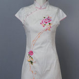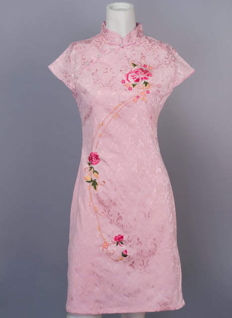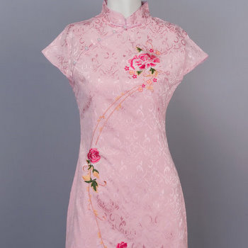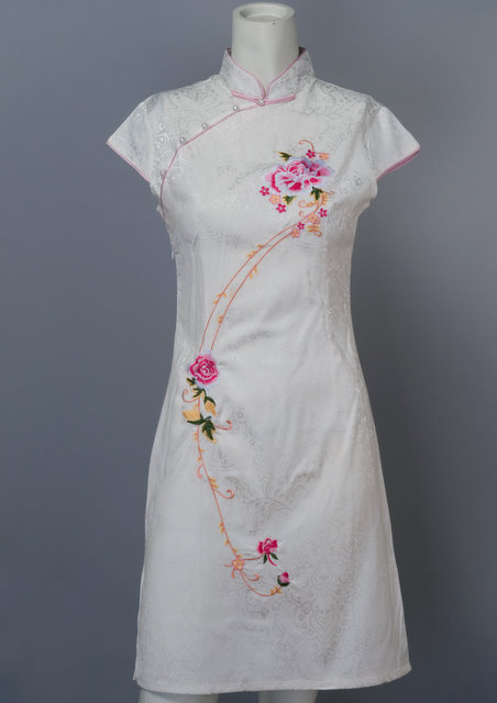 Embroidered peony flowers are set against pink or white brocade fabric. A graceful and elegant dress that is sure to turn heads! Perfect for any special occasion or night out.