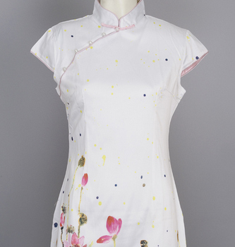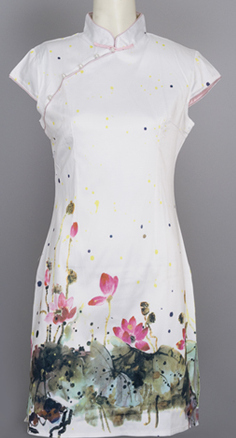 This stunning Mandarin dress is designed with lotus flowers that rise from the hemline. A frog button and contrasting trim add a playful element to finish off the dress. The simple, understated elegance of this dress makes it perfect for both day and evening wear.