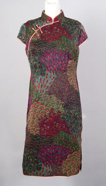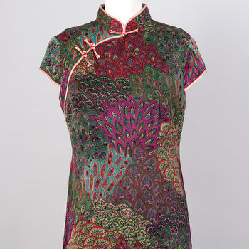 This beautiful Mandarin dress or Qibao is perfect for those who want to be highfashion and graceful. Similar to other Mandarin dresses, it is capsleeves that features a mandarin collar and frog buttons across the top. Unlike any other dresses, this form-fitting Mandarin dress is filled with rich and intricate peacock patterns on 100% silk. This is definitely a crowd-pleaser and a standout amongst everyone's outfit. Perfect for a fancy night out or anytime you want people talking on your fantastic taste in clothing.