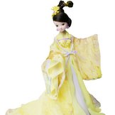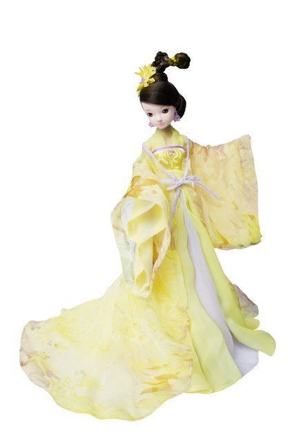 Princess Chrysanthemum wears a dress accented with green, yellow and other combination of beautiful colors with elegant hair decorations, yellow Chrysanthemum flowers and flowing decoration.