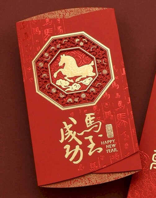 A festive greeting card for the Year of the Horse featuring a red background with gold foil accents and a stylized horse illustration. The design includes traditional decorative elements and “Happy New Year” text in both Chinese and English, incorporating the Chinese idiom 马到成功 (mǎ dào chéng gōng) — “May success come galloping your way!” Inside the card is space for a personal message. Suitable for Lunar New Year celebrations and seasonal gifting.