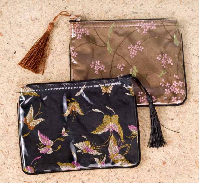 This elegant and practical floral zippered cosmetic purse is perfect for storing just about everything. Made of vinyl-covered, brocade fabric, this travel bag is great for storing jewelry, cosmetics, coins, or any small items. A lovely tassel decorates the zipper. Choose from black butterflies or brown flowers. Matching Large Tote Bag and Business Card Holder are also available.