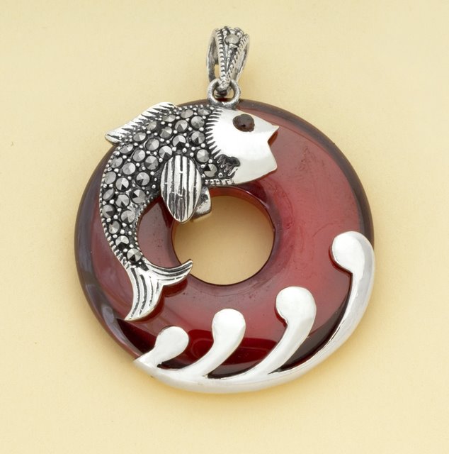 This exquisite pendant is designed with high quality jade in gree or red decorated with fish in sterling silver. A eye catching pendant for anyone.