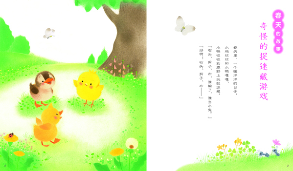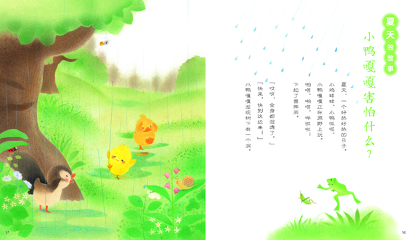 小鸡球球和好朋友小鸭嘎嘎和小鸭呱呱可爱的四季冒险故事,带领小朋友们来到野外,感受春天万物的生机勃勃,夏季突然降临的闪电雷雨和美丽彩虹,秋季金色的丰收果实和凉飕飕的需要取暖的冬季。每个季节的故事后附有四季图鉴页,告诉孩子们在这个季节里会见到哪些可爱的植物和小动物。
