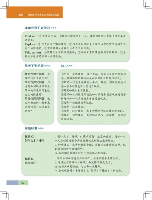 ● 融入IB MYP 课程中的概念教学、探究教学、评估、ATL,每单元加入跨学科设计和外国文学的相关内容。