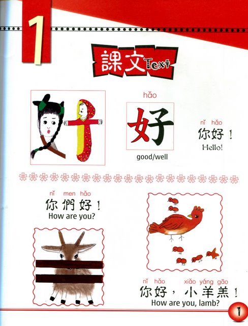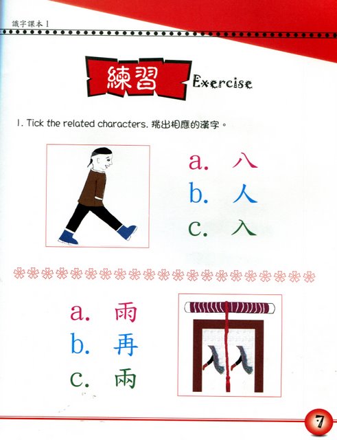 這套教科書的課文和練習集中了漢字的結構,漢字的分離、漢字的組合以及聲旁和形旁的組合形成了更多的漢字,能夠使學生記住,識別和書寫大量的漢語詞彙,如木+口=杏;问=门+口, 等,書中有: