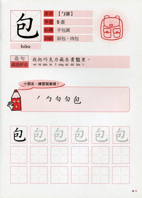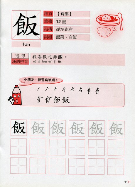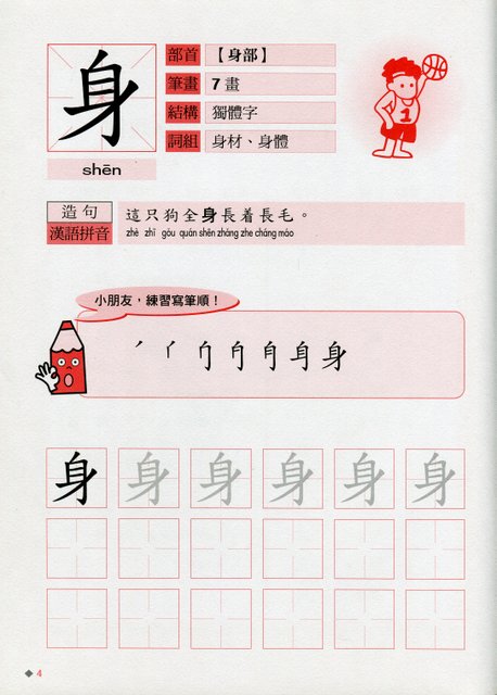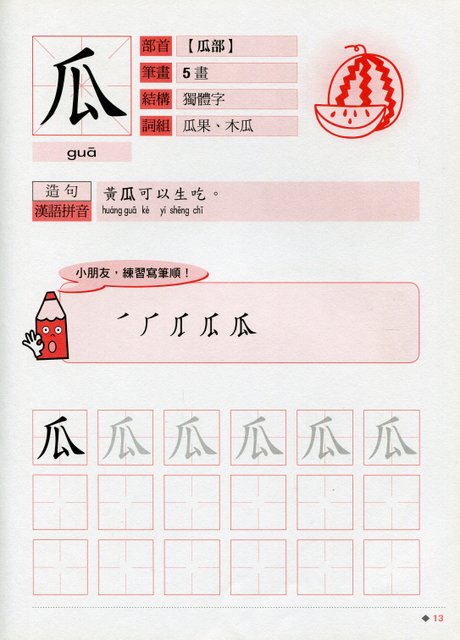 本套筆順筆劃以兒童生活常見的食物、用品、身體、水果為主題,認識中文的字形結構和筆順筆劃。學習詞組和造句,加注漢語拼音,還有練習寫字,鞏固所學。