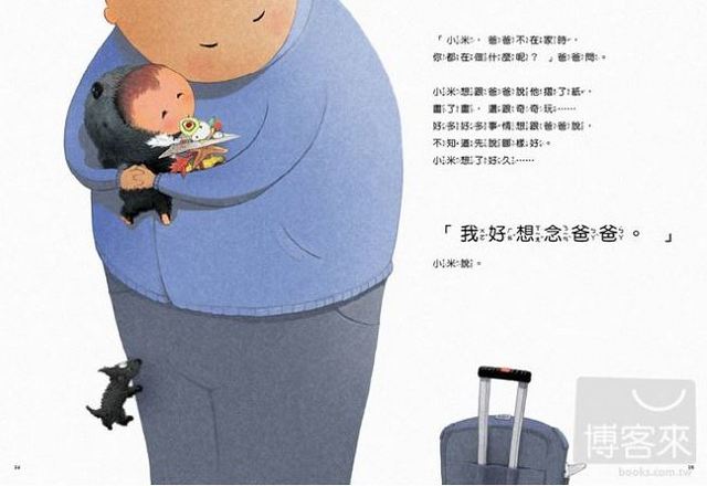 小米有個小袋子,總是走到哪兒,拖到哪兒,裡頭裝的是他最重要的寶貝,為了最重要的那一天,最重要的那個人而準備......感受書中思念的溫度,你會明白孩子有多愛你!為了即將到來的那天,小米一直在傷腦筋,總是有好多事要做。他蒐集了許多東西,摺了紙、畫了圖……甚至還找了連話都還不會說的小妹妹商量,最後把這些東西都裝進跟他形影不離的布袋裡……心瑜用簡單的文字,配上很會說故事的圖,創作出一個小小孩想念爸爸的可愛故事。淡淡的筆觸,細細描繪出小小孩幽微的心思,每句話、每個動作都在鋪陳累積對爸爸濃濃的思念。專屬爸爸的繪本,感動上市。