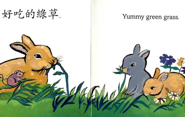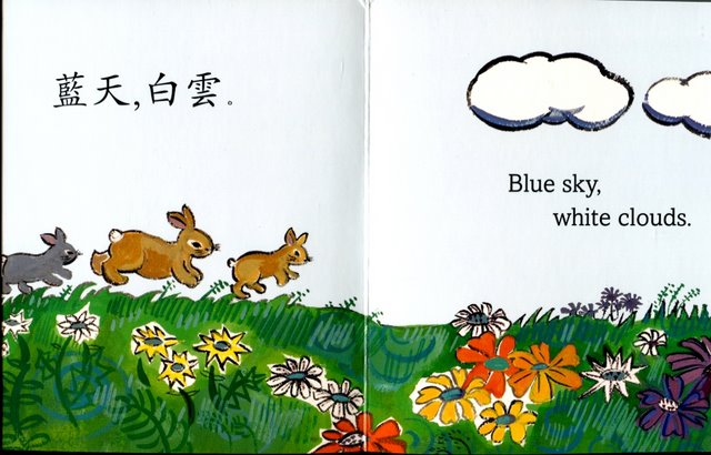It's summer, and the meadow is in full bloom. As some bunnies hop along, they see blue sky, white clouds, and yummy green grass. How many more colors can be found? Look for an explanation of tonal marks at the end of the story, along with pinyin translation of the Chinese characters.