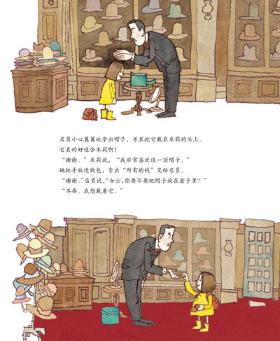 When Millicent cannot afford the hat she sees in a store window, the clerk remembers that he has a special one that's perfect for her budget. This imaginary hat can be any size, shape, or color that she prefers. As she walks down the street wearing it, Millie is inspired. Soon she has a hat like a peacock, then a cake, next a flower, and then a fountain. In the park she discovers that everyone has a special hat. Back home she tells her parents all about her day and soon they too are sporting hats.