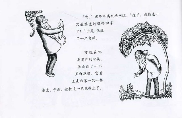 老奶奶想养一只猫,老爷爷就出门去找猫。他来到一个到处都是猫的山丘,把碰到的每一只漂亮的猫都带走了,于是,有几百只猫、几千只猫、几百万只猫、几千万只猫、几亿万只猫,都跟着老爷爷回家了。为了要留下一只猫,所有的猫开始争论谁最漂亮,这些猫气得你吃我我吃你,最后只有一只很不起眼的小猫活下来了。老爷爷和老奶奶终于发现,这只猫是世界上最漂亮的猫……