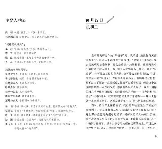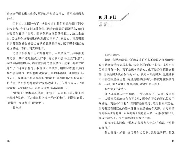 托德屡犯校规,受到校方的惩罚,被勒令在指导教师伍德罗夫人的监督下,每天放学后写留校日记。为了凑字数,托德或是随意描写眼前所见,或是肆意嘲讽校规及老师和同学,但即便如此,也能从中看出他良好的语言表达能力。其实,伍德罗夫人早就用她独到的眼光发现了这一点,所以,采用了这种独特的处罚方式来挽救托德。每天的留校日记让托德的对抗心理渐渐平复了,他开始真实地、详细地记录自己的生活和所思所感。37篇日记完成后,一个同情弱者、重义守信、聪颖能干、热爱阅读的少年形象跃然纸上,人们更从指导老师伍德罗夫人身上感受到了美好人格感召之下的教育的力量。