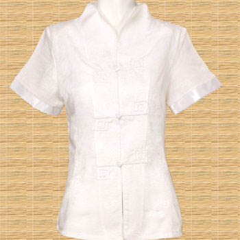 Designed with silk and linen, this blouse makes a perfect Spring/Summer wardrobe addition. The lightweight fabric will keep you cool during the summer heat, and the stylish cut makes it a perfect match for underneath a classic suit coat. The shirt is decorated with a light Chinese motif design and offers traditional Chinese knot button closures and white silk trimmed sleeves.