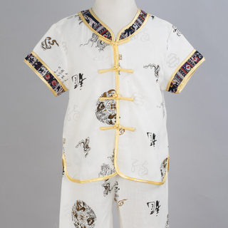 Created from comfy linen, this 2 piece pajama suit features dragon text and design. It is finished with a Mandarin collar and frog buttons. The short sleeves and cropped bottoms makes this is the perfect warm weather attire.