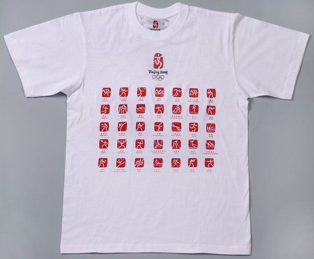 Created from 100% cotton, these T-shirts feature Olympic pictograms of different sports and the 2008 Beijing Olympics "Running Man" emblem. Thread trim around the sleeves and bottom of the t-shirt. Choose from different colors. Visit the Beijing 2008 website for more information on the Olympics logo, click here.